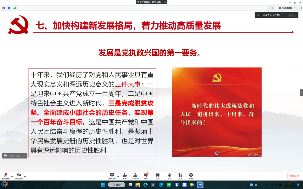 刘小鹏向大家介绍了全国脱贫攻坚总结表彰大会和我国脱贫攻坚战取得全面胜利的庄严宣告,并带领同学们从脱贫攻坚取得的伟大成就、光辉历程和宝贵经验等方面进行深入学习。