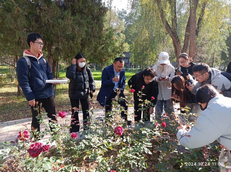 10月24日,何俊、李茜老师带着同学们在学校三个校区开展了以“探索植物世界 认识校园植物”为主题的课程实践。“玫瑰和月季都是蔷薇科的植物,玫瑰的叶片表面是褶皱的,月季的叶片表面是非常光滑的;月季的刺相对较大,而且比较稀疏,玫瑰枝干上的刺比较小,更加密集;月季的花色更加丰富-----”同学们仔细聆听着何俊老师讲解校园里的植物,将植物地理知识带到周围每一株植物,赋予课堂别样的生趣。