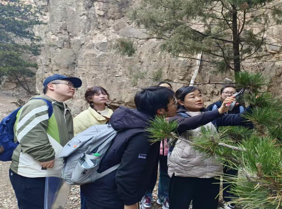10月27日,何俊、李茜老师带着同学们在贺兰山国家自然保护区苏峪口站开展了以“拓展植物识别技能分析垂直分布规律”为主题的课程实践。利用课堂所学知识,实地调查和分析植物的垂直地带性分布规律。同学们跟随两位老师爬上兔儿坑,沿途认识贺兰山植物,然后以小组为单位,按照四个海拔梯度进行植物调查,采集植物标本、测量植物的胸径和株高,记录海拔、坡向等信息。“认植物其实就像认人一样,用心对待,自然瞧出分别;能从不同植物器官上观察到它如何适应不同地形和气候条件。”在植物调查过程中,李茜老师认真传授植物分类知识。