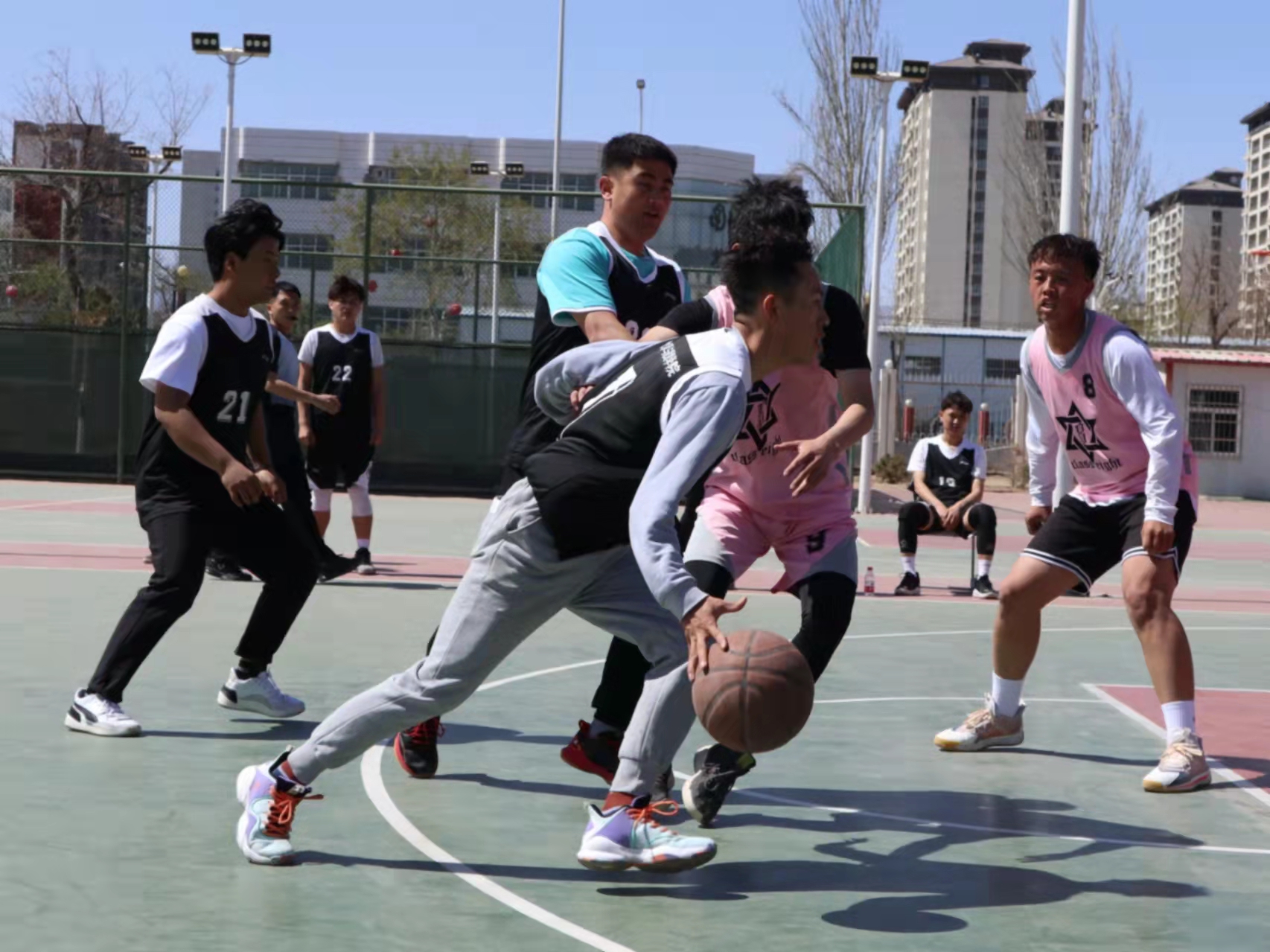 篮球队队员主动出击,以矫健熟练的动作迅速传球,直逼篮板,我院篮球队队员迅速回守防攻,防守失败,对方暂时领先。双方篮球队队员冷静应对,变换进攻防守方式。双方队员激情高涨,雄姿英发,比赛愈发激烈。篮球场上,面对人文pk10
